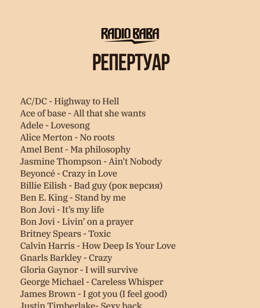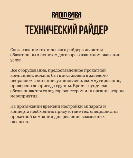 Мы привозим свои инструменты (барабаны/гитары), микрофоны, мониторинг, пульт, коммутацию.